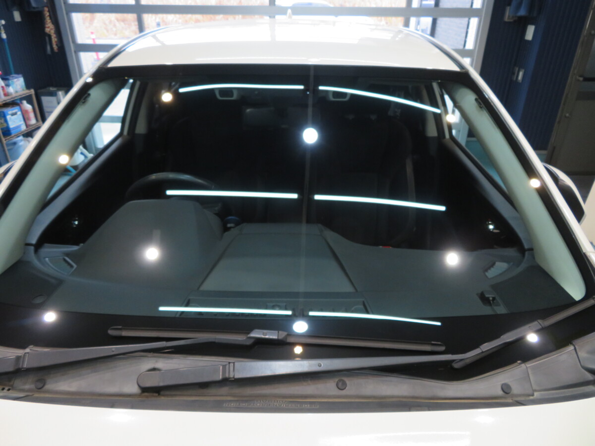 純正ガラスはアイサイト/デアイサー(熱線)/レインセンサー/IR(断熱)/遮音とたくさん付いた仕様です。
